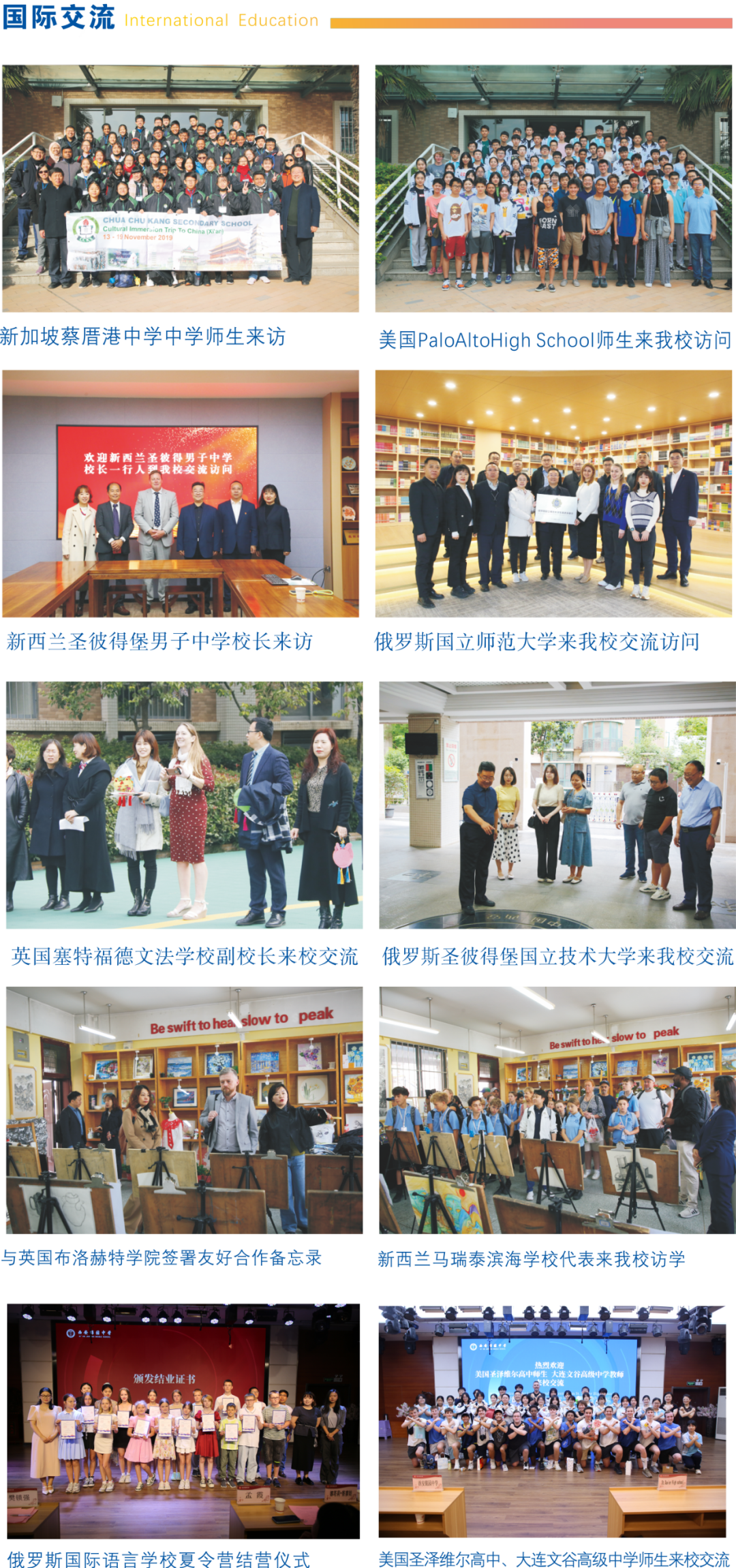 为培养具有国际视野和跨文化交流能力的高素质人才,西安锦园中学积极推进与国外优秀学校的深度合作,开展形式多样的师生交流项目,全方位拓宽学生的国际视野。学校积极搭建平台,经常组织学生前往美国、英国、新西兰、澳大利亚、瑞士、新加坡等国家进行研学活动。西安锦园中学与俄罗斯国立师范大学、新加坡中正中学、新加坡康培学校、新西兰奥克兰马瑞泰滨海学校、加拿大布鲁克林学校缔结为友好姊妹学校,深化交流合作。