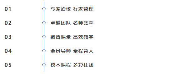 学校全面推进数智课堂,坚持五育融合,全面落实立德树人根本任务,学校成立了学生发展指导中心、心理素质培养中心。开设丰富多彩的校本社团课程,涵盖初高衔接、学科拓展、艺术素养、阳光体育、科技创新、传统文化、高端运动等。学校国际化办学氛围浓厚,以“民族脊梁,世界精英”为办学目标,既着眼于学生终身发展,又关注学生学业素养提升,致力于办成一所国内知名、有世界影响力的“高品质、高质量、数智化、多元化”的新样态学校。