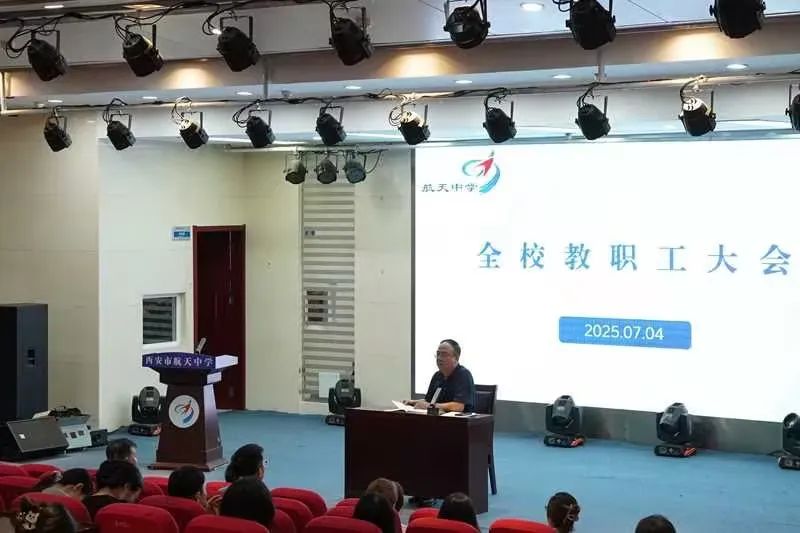2025年7月5日,西安市航天中学2024-2025学年第二学期期末总结大会在报告厅举行。会议由丁宝林校长主持,全体教职工参会,共同回顾一学期奋斗足迹,展望新学期发展蓝图。