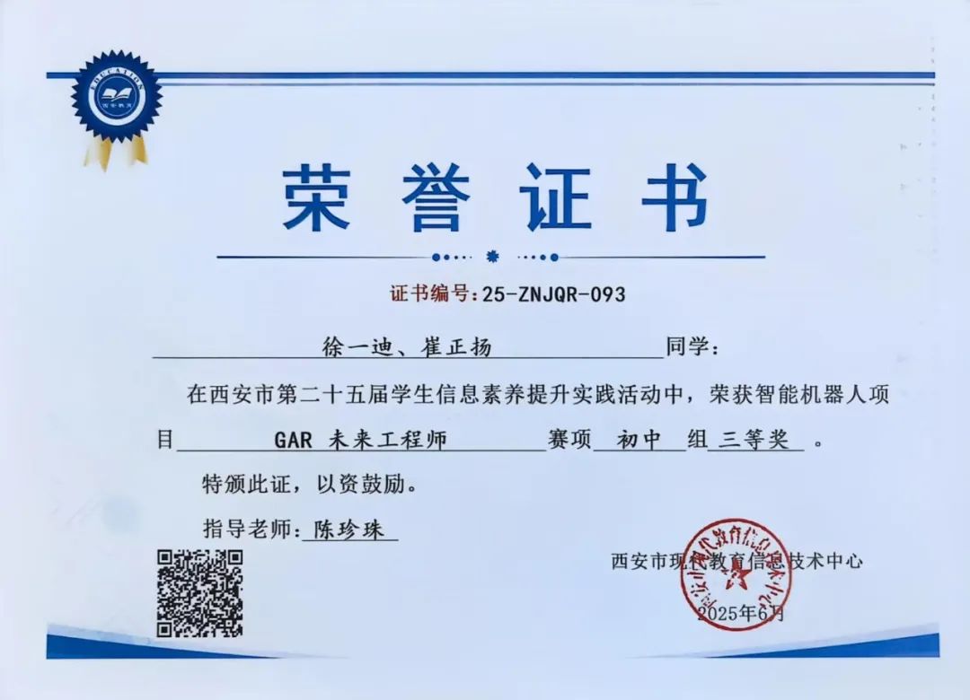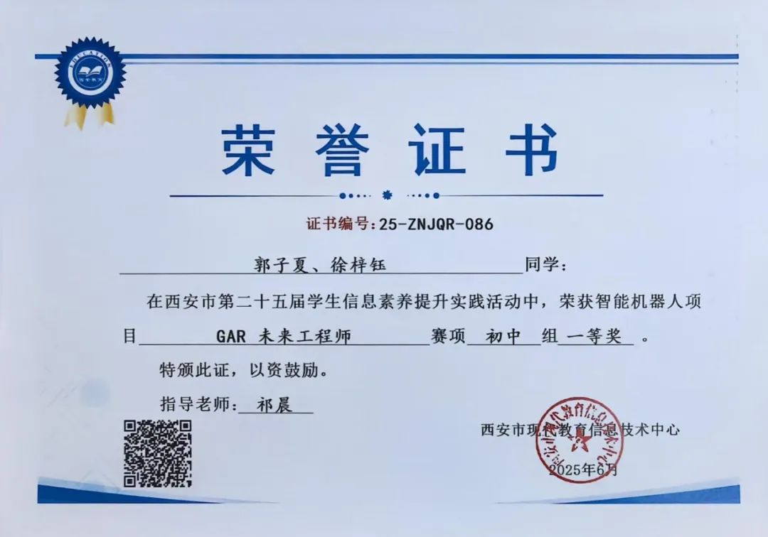 郭子夏、徐梓钰同学在西安市第二十五届学生数字素养提升暨人工智能教育实践活动中,荣获智能机器人项目GAR未来工程师赛项初中组一等奖。指导教师为祁晨老师。