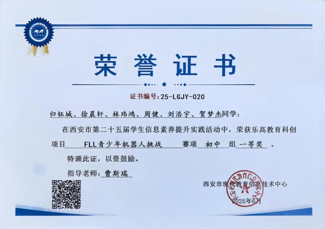 归钰城、徐晨轩、林玮鸿、周健、刘浩宇、贺梦杰同学在西安市第二十五届学生数字素养提升暨人工智能教育实践活动中,荣获乐高教育科创项目FLL青少年机器人挑战赛项初中组一等奖。指导教师为曹斯瑞老师。