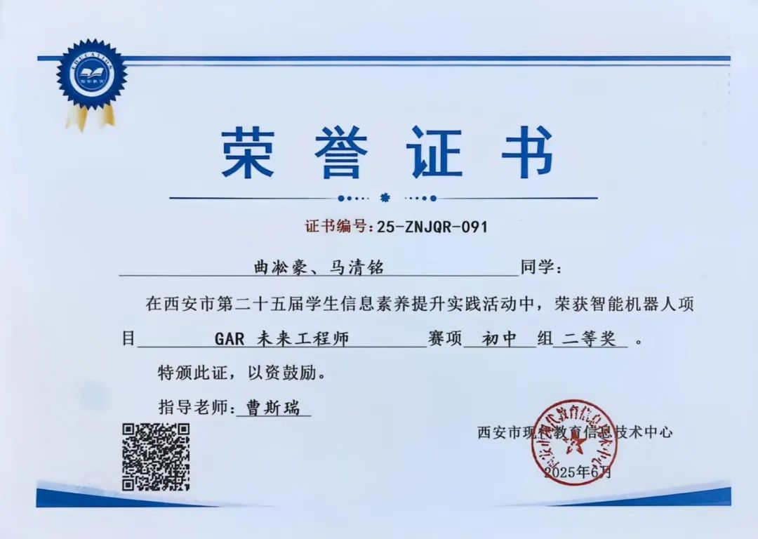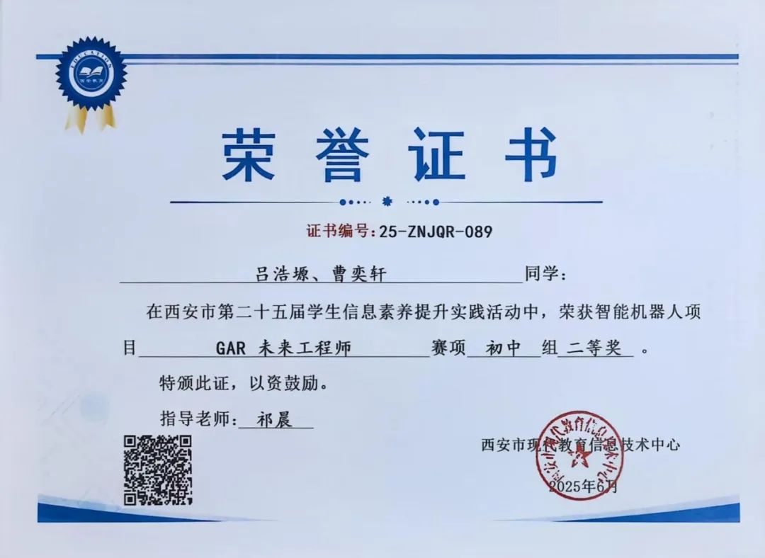 吕浩塬、曹奕轩同学在西安市第二十五届学生数字素养提升暨人工智能教育实践活动中,荣获智能机器人项目GAR未来工程师赛项初中组二等奖。指导教师为祁晨老师。