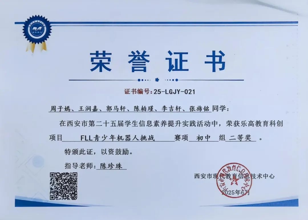 周子嫣、王润嘉、郭马轩、陈柏瑾、李吉轩、张旆铭同学在西安市第二十五届学生数字素养提升暨人工智能教育实践活动中,荣获乐高教育科创项目FLL青少年机器人挑战赛项初中组二等奖。指导教师为陈珍珠老师。