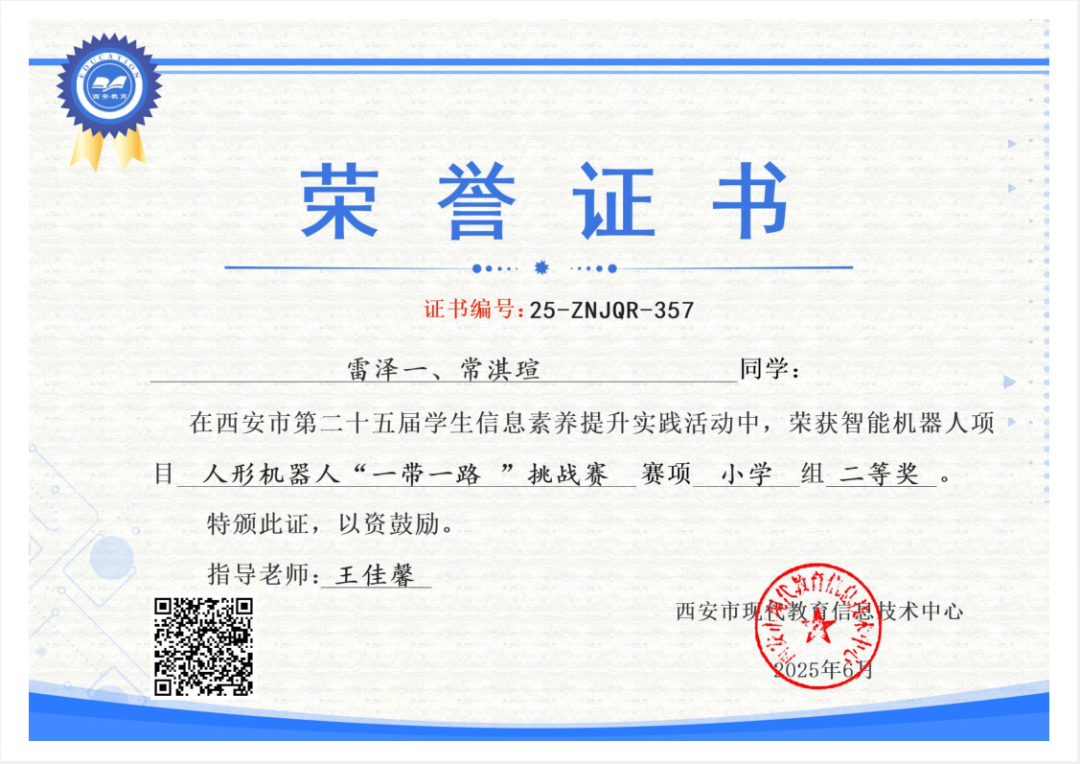 雷泽一、常淇瑄同学在西安市第二十五届学生数字素养提升暨人工智能教育实践活动中,荣获智能机器人项目人形机器人“一带一路”挑战赛赛项小学组二等奖。指导教师为王佳馨老师。