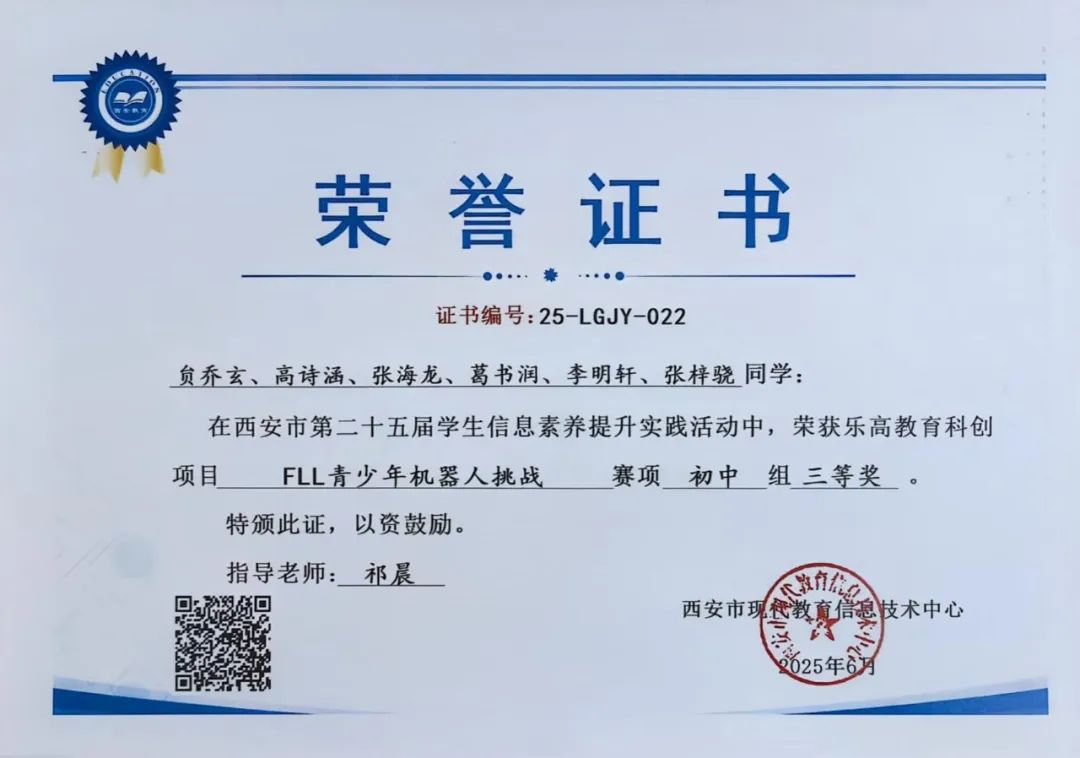 贠乔玄、高诗涵、张海龙、葛书润、李明轩、张梓骁同学在西安市第二十五届学生数字素养提升暨人工智能教育实践活动中,荣获乐高教育科创项目FLL青少年机器人挑战赛项初中组三等奖。指导教师为祁晨老师。