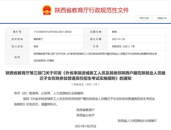 第十九条本实施细则从印发之日起施行,至2025年12月31日自行废止。省教育厅、省公安厅、省人力资源和社会保障厅2013年联合印发的《进城务工人员随迁子女在陕参加普通高校招生考试实施细则》即行废止。