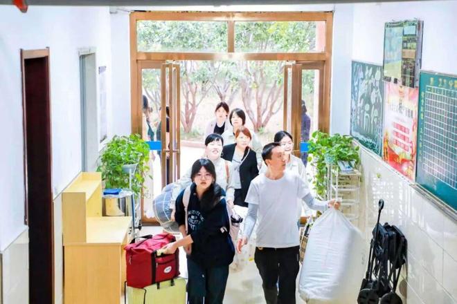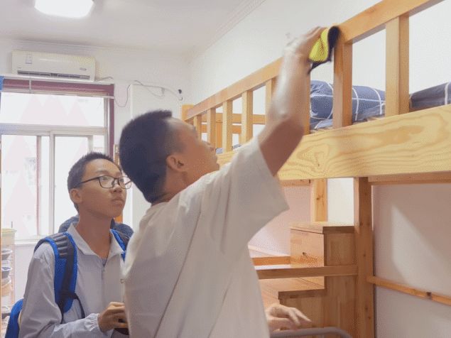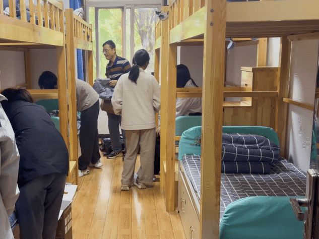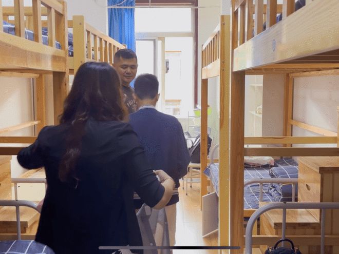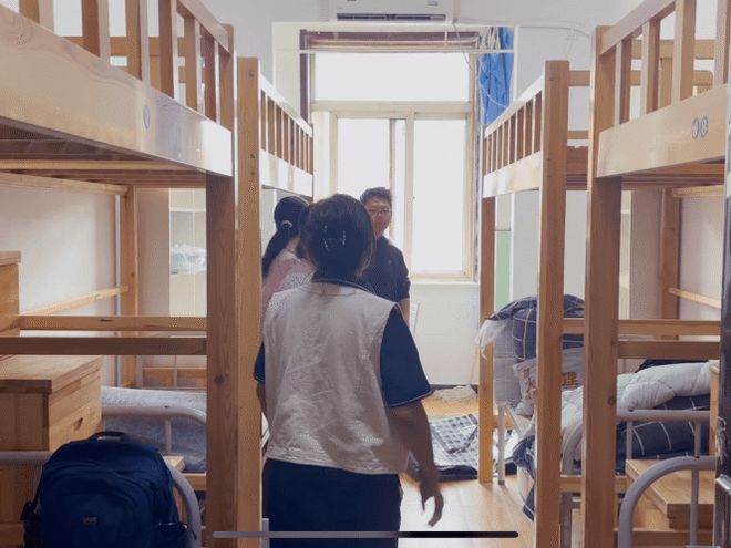 新生与家长们一同前往宿舍,开启 “整理新家” 的温馨时刻。走进宿舍,崭新的床铺、书桌、衣柜整齐排列。铺床单、套被罩、摆放生活用品、偶尔与同宿舍的新同学小声交流,陌生感在协作与对话中渐渐消散。生活老师穿梭在各间宿舍,反复叮嘱 ,嘱咐学生要共同维护‘小家’”。不少家长整理完后,还不忘给孩子和新宿舍拍张合影,记录下这一 “成长里程碑”。