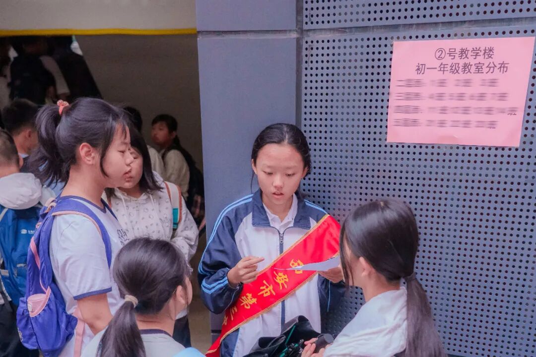 晨曦微露,志愿者同学和老师早早在校门口迎接,帮助新同学顺利报到。新生进班报到、住校生到宿舍“安家”,井然有序,有条不紊。