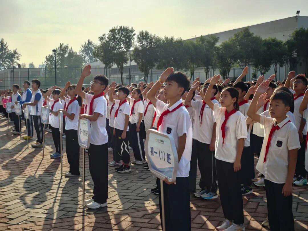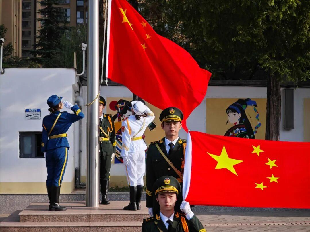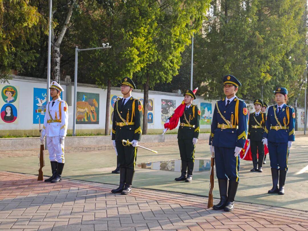 庄严的国歌声中,五星红旗冉冉升起。全体师生行注目礼,爱国主义情怀在每个人心中激荡。