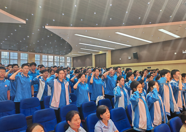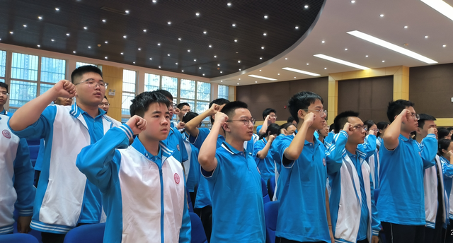 大会最后,全体住校生肃立举拳,庄严宣誓。报告厅内回荡着铿锵有力的青春誓言,同学们目光坚定、神情庄重,以饱满的热情许下对集体生活的承诺,展现出遵规守纪、共建文明宿舍的决心和积极适应新环境、迎接成长挑战的勇气。