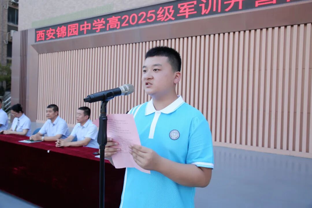 高一新生代表王家烁在发言中表达了迎接挑战、磨练自我的坚定信心,承诺将严格遵守纪律、认真完成训练。
