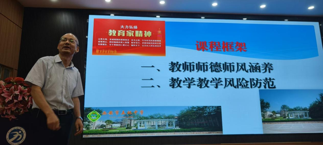 随后,特邀高级教师,陕西省国培计划等多个项目的专家库成员,陕西师范大学、西北大学、陕西学前师范学院、西安文理学院等单位教师教育项目授课专家刘玉生老师做了题为《师德师风建设与教学风险防范》的培训。