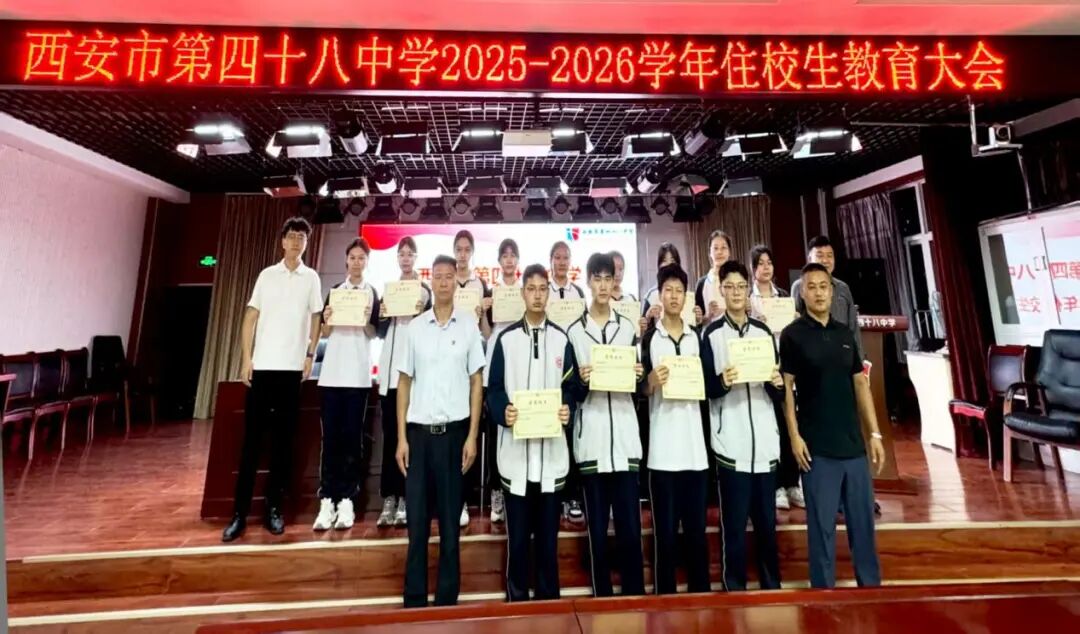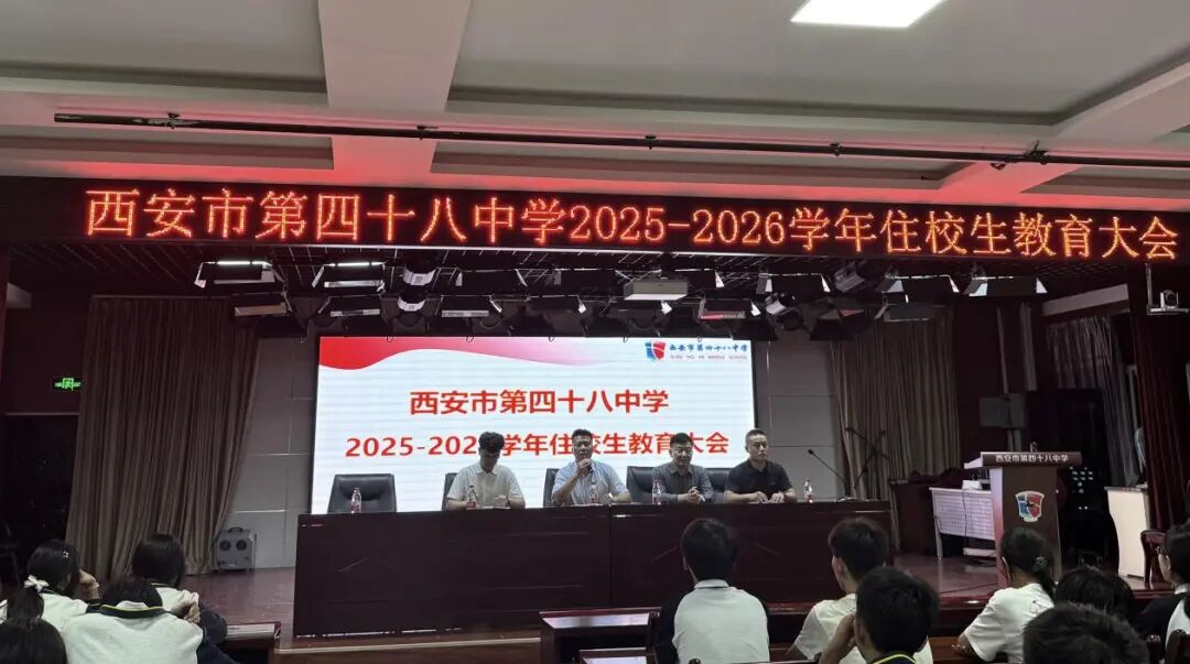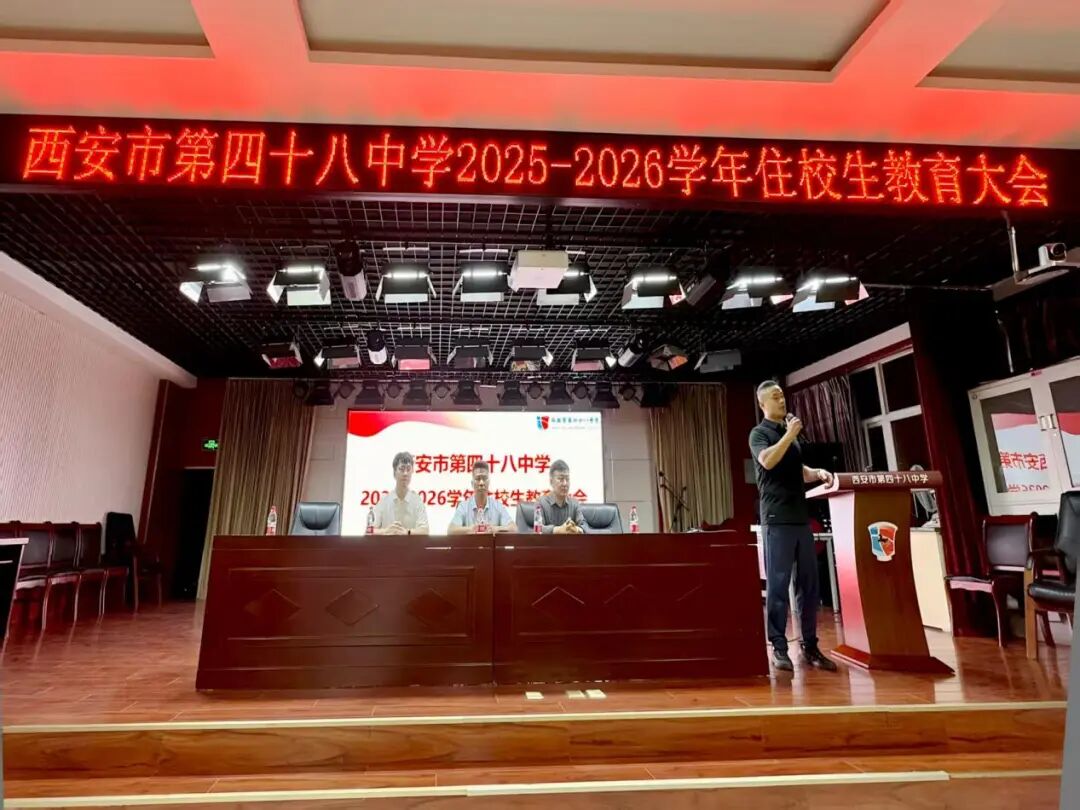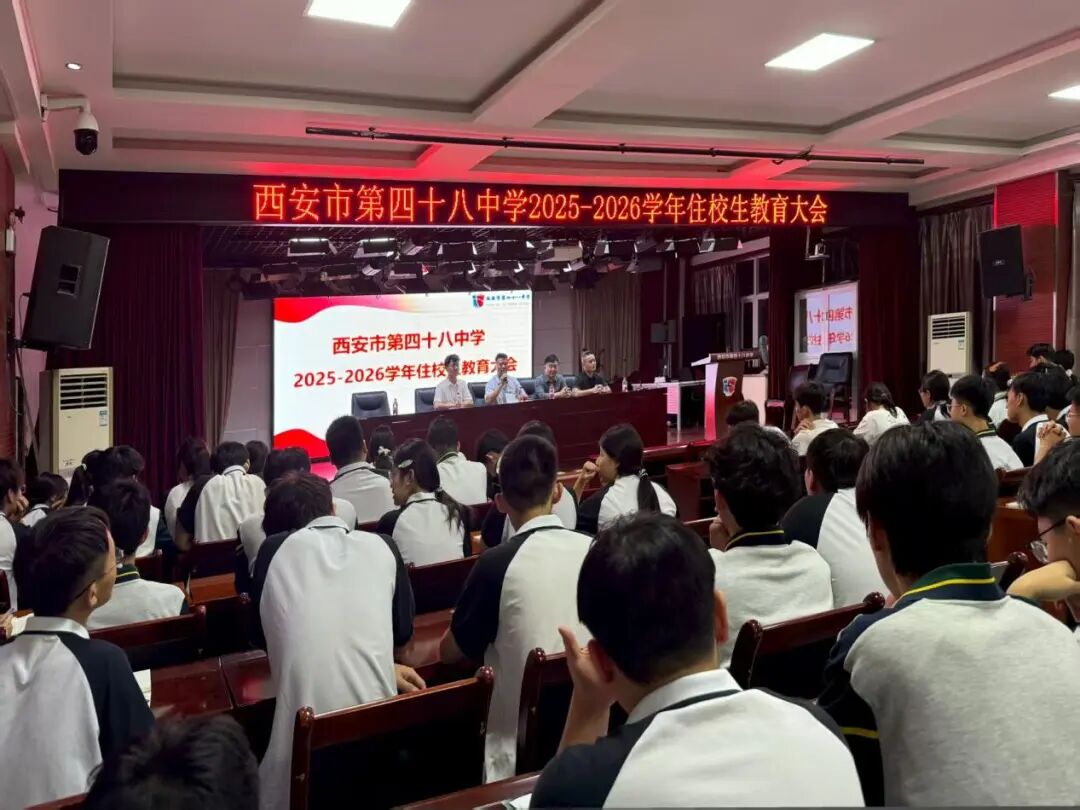 2025年9月3日,西安市第四十八中学2025-2026学年住校生教育大会在学校5楼多功能会议室举行。会议由校安保处副主任杨飞主持,副校长米彦武出席会议并讲话,全体住校生参会。