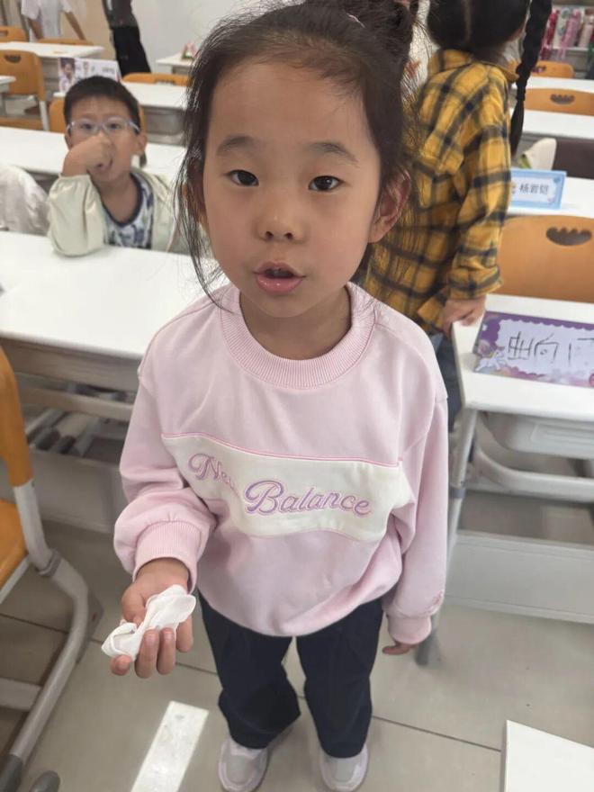 一年级的小朋友用稚嫩的声音说:“老师告诉我们,校园是我们的家,要一起爱护!”她手里还紧紧拿着刚捡到的小纸片,那认真的模样,真是太可爱了!