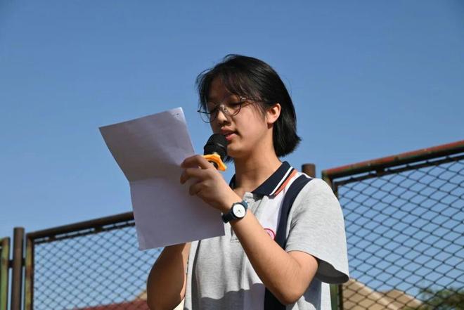学生代表高三一班李欣怡同学发言。在对高一、高二的学弟学妹们送上美好祝福的同时,勉励高三学子心怀感恩,轻装上阵;专注当下,脚踏实地;相信集体,携手共进。以满腔的热血与激情,去登越每一座高峰;以顽强的毅力与勇气,去挑战学习路上的每一个难题。用汗水书写属于自己的辉煌。
