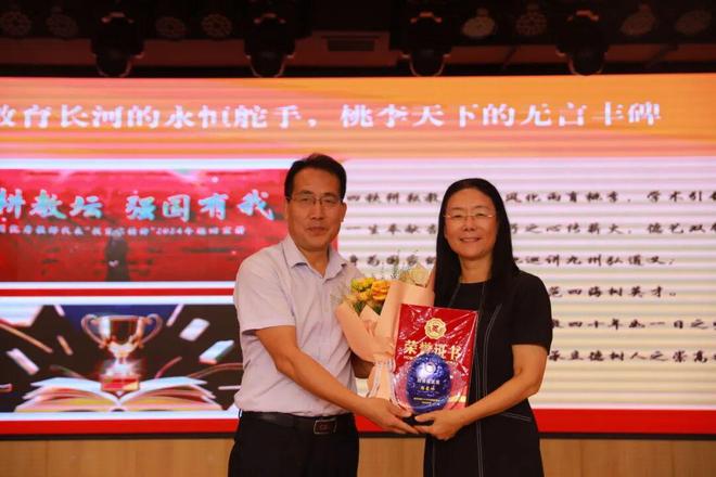 在表彰先进、致敬奉献的热烈氛围中,学校为耕耘教坛四十三载的杨筱冰老师隆重颁发“学校终身成就奖”。作为国家级名师,她以巡讲为桥,传递教育道义;作为教育家典范,她以垂范为灯,培育时代英才,用德与艺的双重坚守,成为无数教育人心中的榜样。