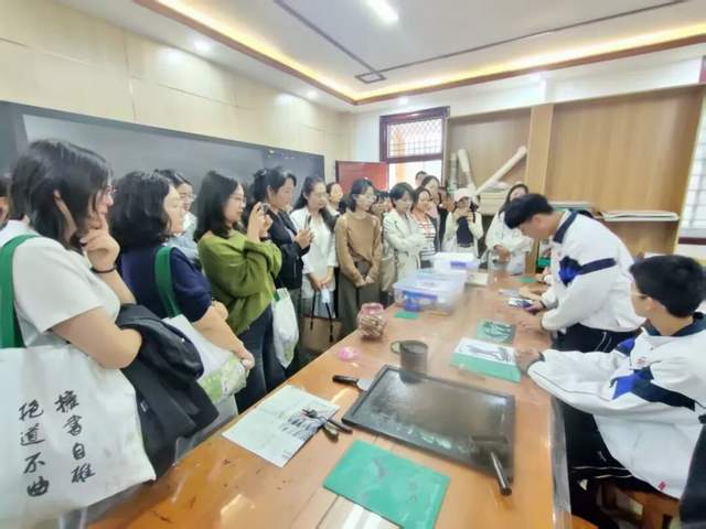 课后,在校办副主任张忠利的带领下,名师团成员参观了学校独具特色的版画博物馆。从版画艺术的源流发展到学校七十余年的传承硕果,名师团成员在方寸之间领略了中铁中学深厚的文化底蕴,并通过亲手体验版画制作过程,深刻感知了版画教育在“五育并举”中的独特魅力。