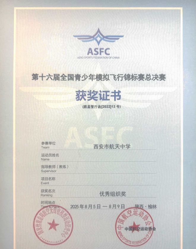 学校在第十六届全国青少年模拟飞行锦标赛中荣获优秀组织奖。