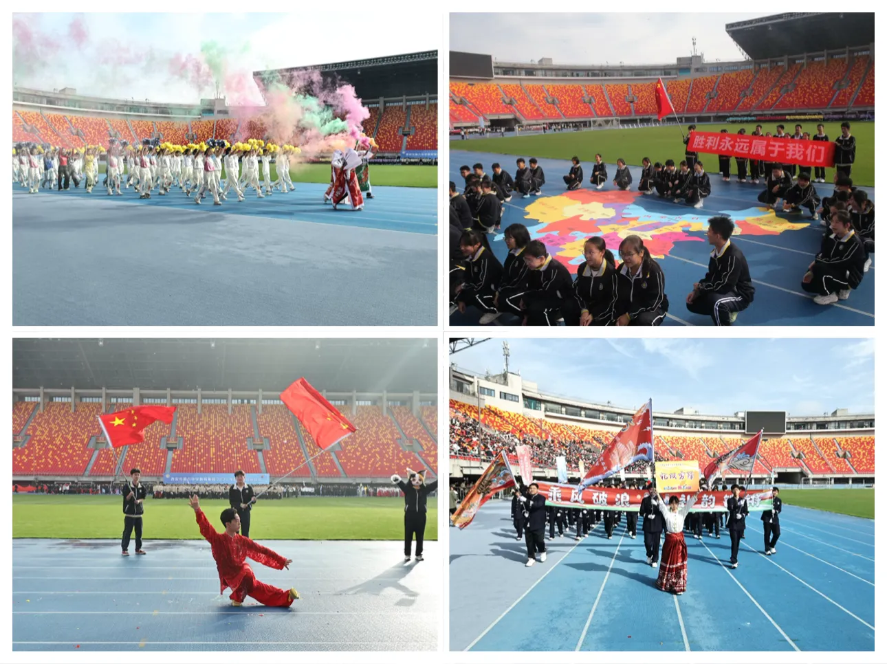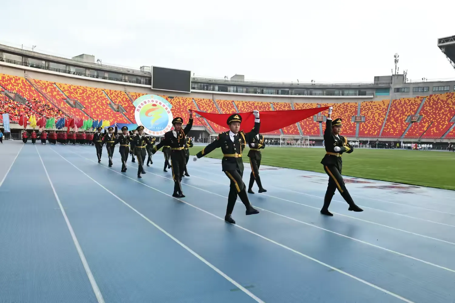 晨光初露,陕西省体育场已是旌旗招展、气氛热烈。在激昂的《运动员进行曲》中,开幕式拉开帷幕。国旗方阵率先入场,仪仗队员步伐铿锵、英姿飒爽;校旗方阵、会徽方阵紧随其后,彰显六中精神;各班代表队意气风发,口号嘹亮,整齐划一的步伐展现着青春风采。 数百名学子组成的表演方阵,以整齐有力的动作、富有创意的队形变换,展现了六中学子的蓬勃朝气,成为赛场一道亮丽的风景线。