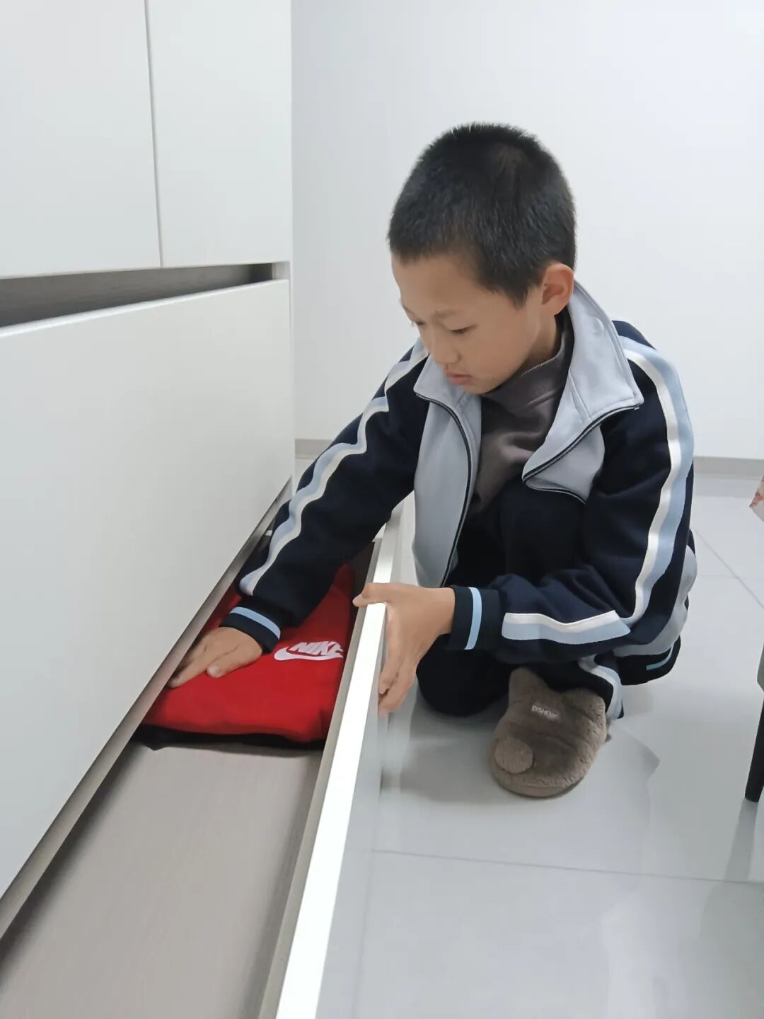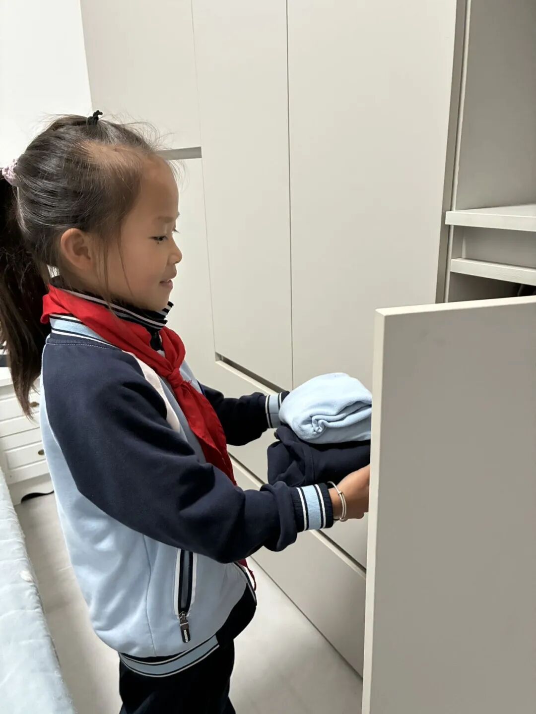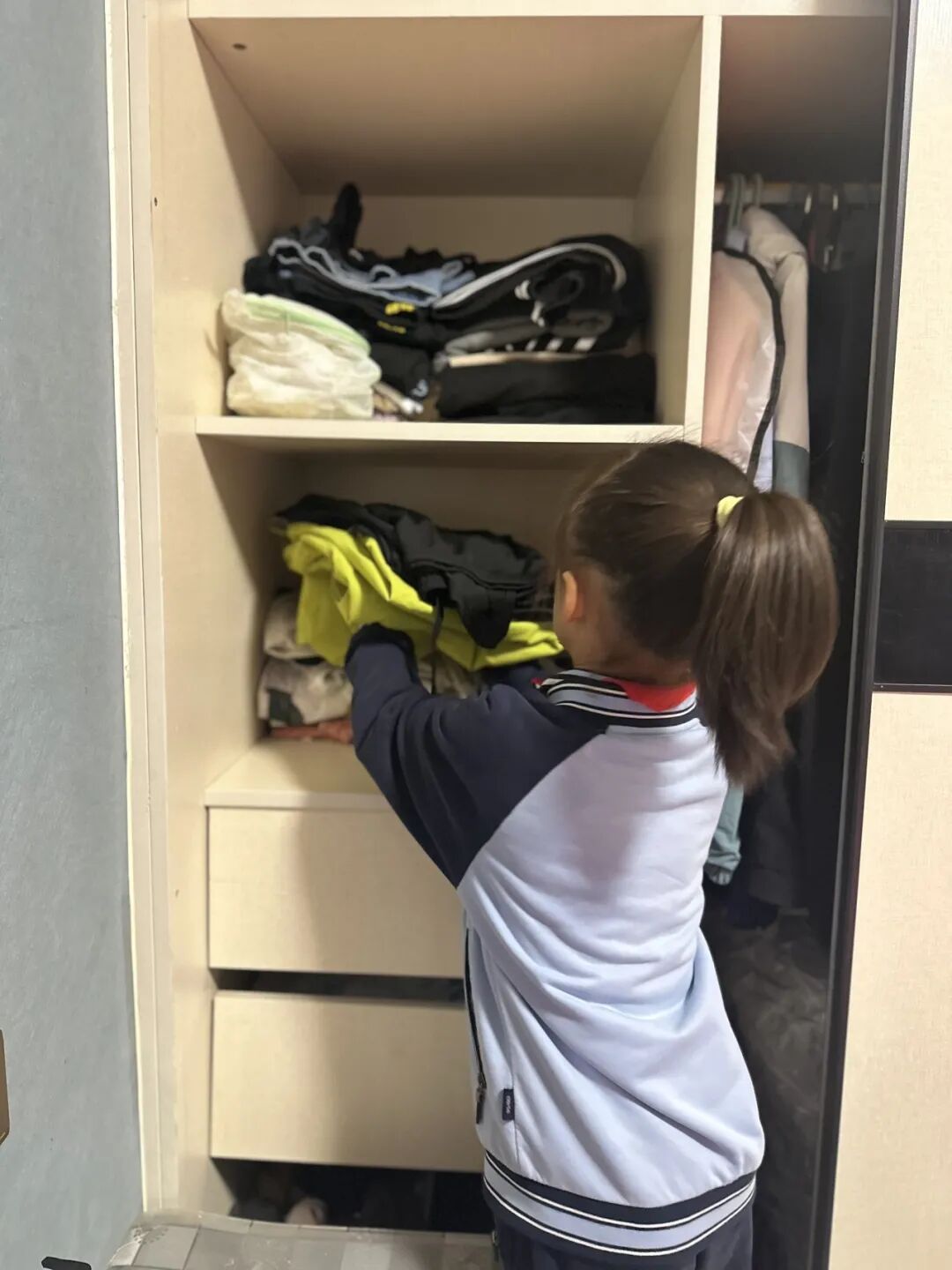 (帮父母做家务,将叠好的衣物放进衣柜)