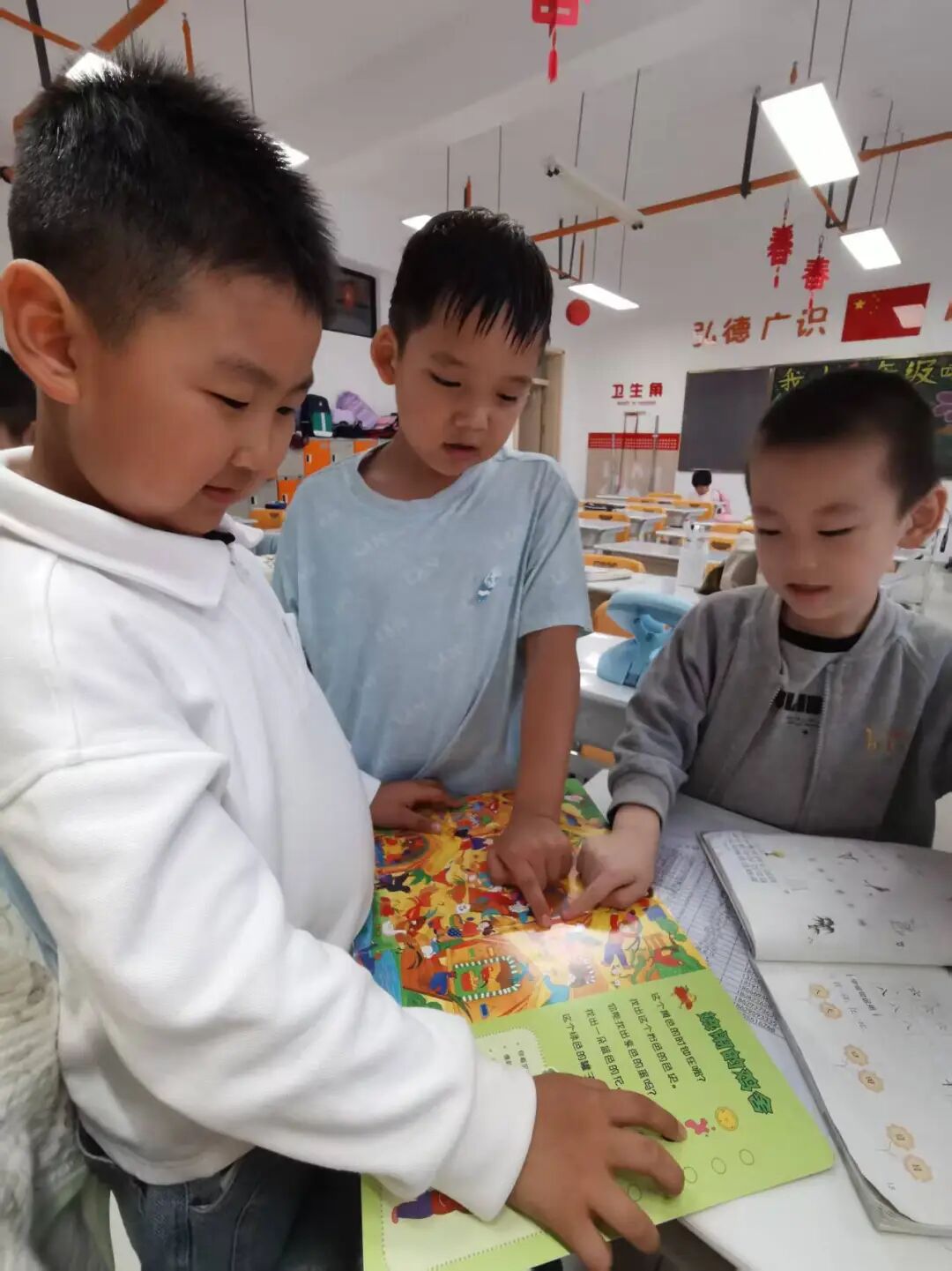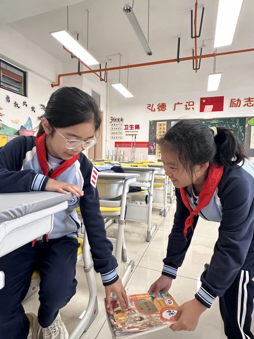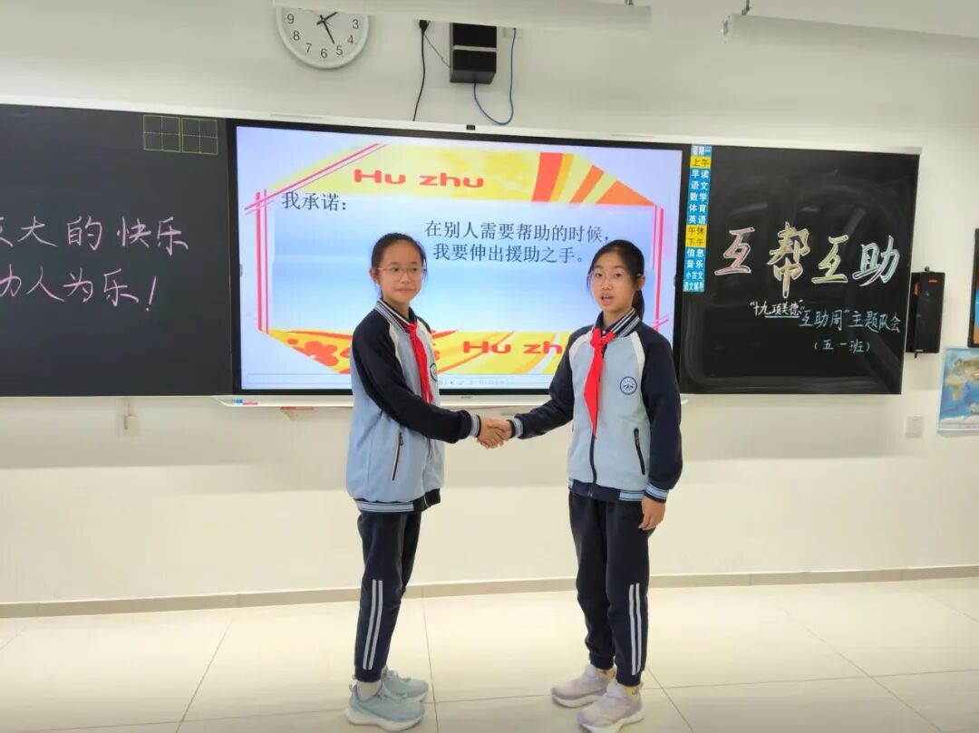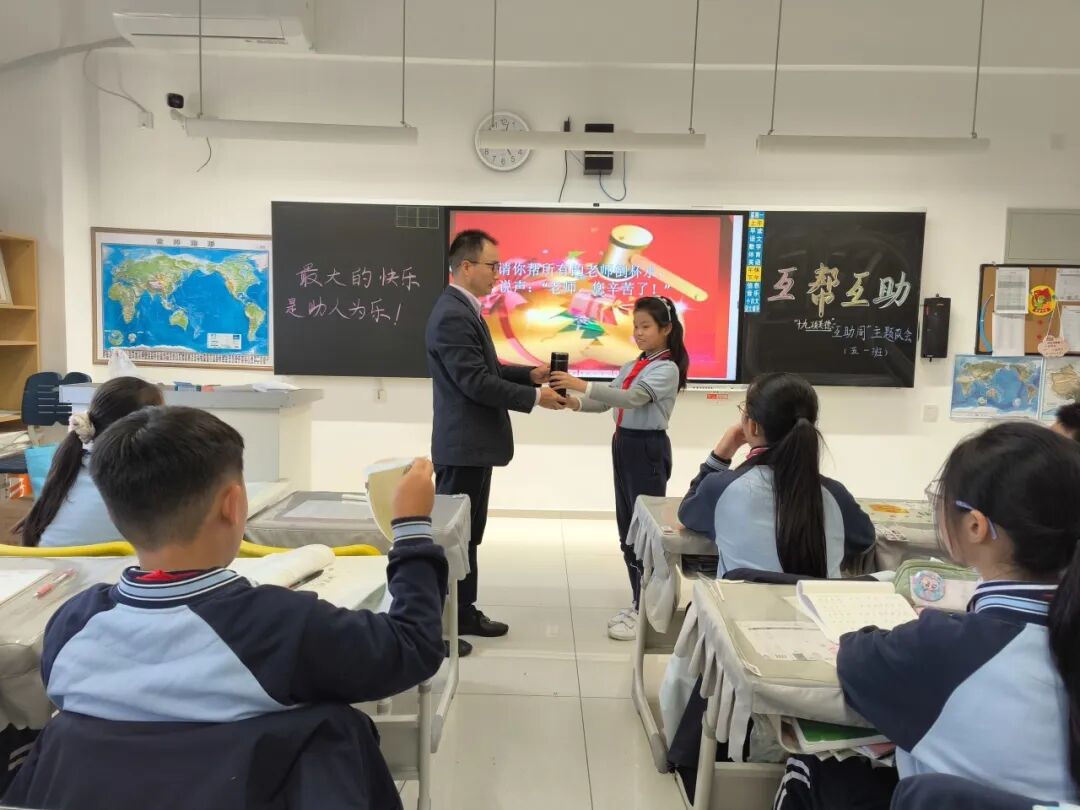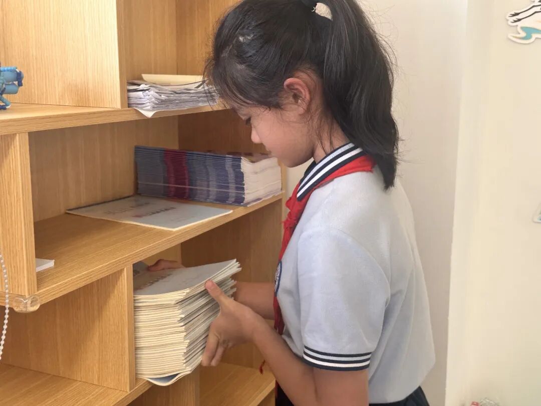 放学时分,韩茹渊同学抱着一大摞作业本,还要整理书桌,忙得不可开交。白则明同学主动上前:“我来帮你整理书桌吧!”两人默契配合,很快完成了任务。老师特别表扬白则明是“乐于助人小标兵”!