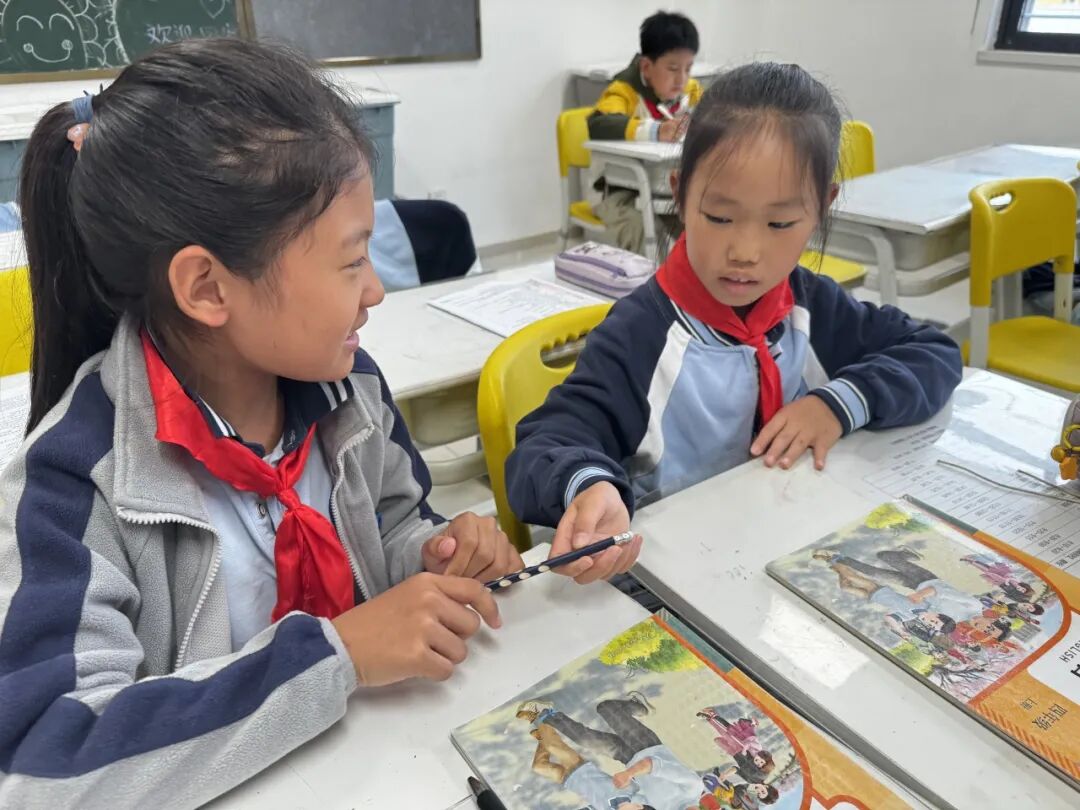 贺嘉昕同学向杨芸浠同学分享铅笔