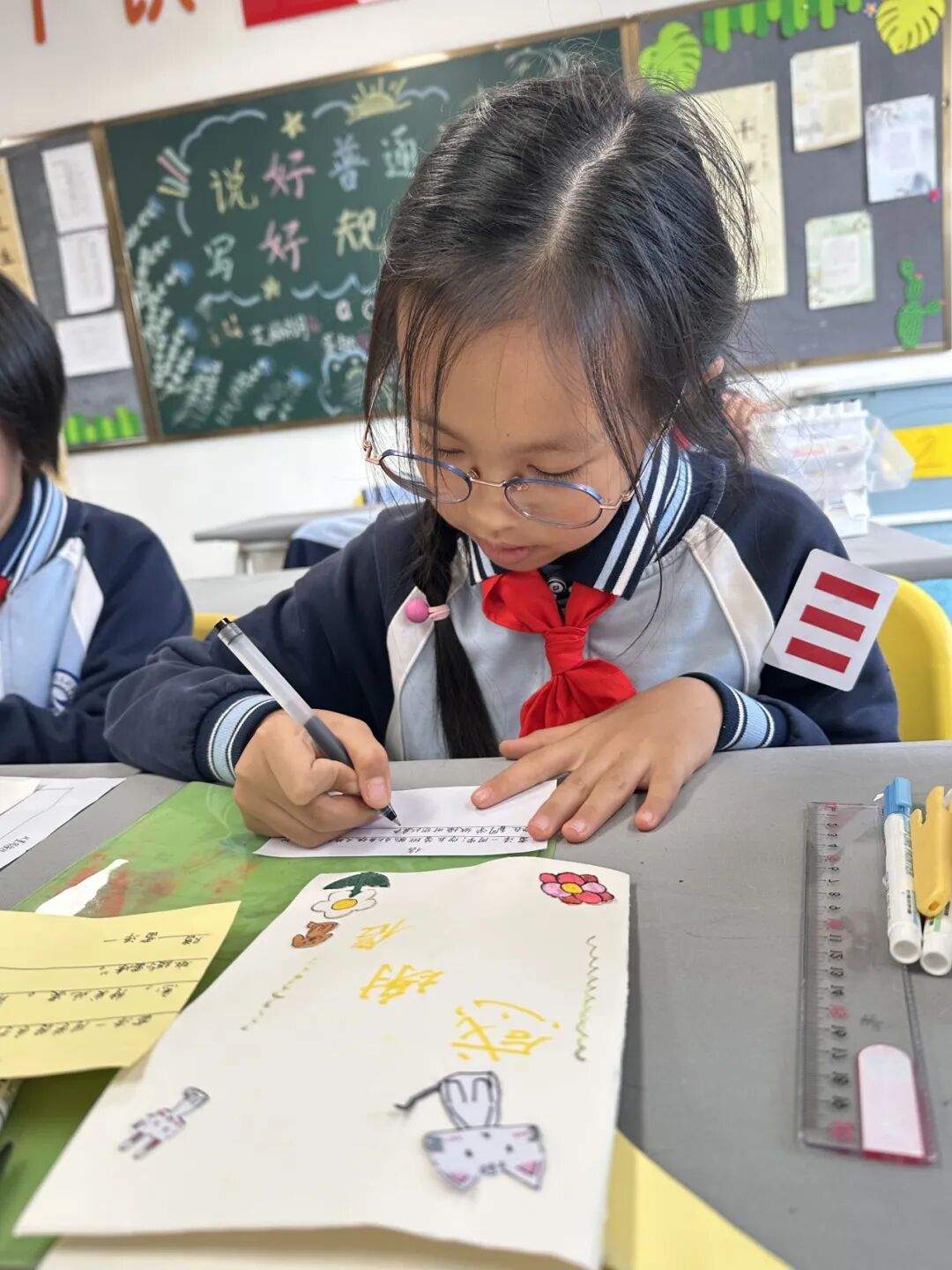 数学考试即将开始,杨芸浠同学的铅笔突然断了,焦急万分。身旁的贺嘉昕同学见状,毫不犹豫地递上一支削好的铅笔:“我有两支,你先用!”考试顺利结束后,杨芸浠同学还特意画了一张感谢卡送给贺嘉昕同学——帮助,让友谊开出小花。