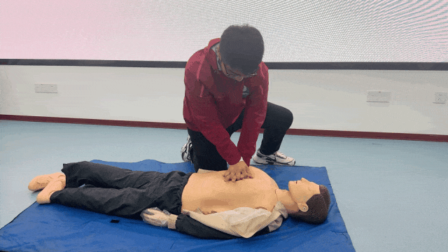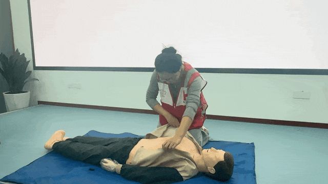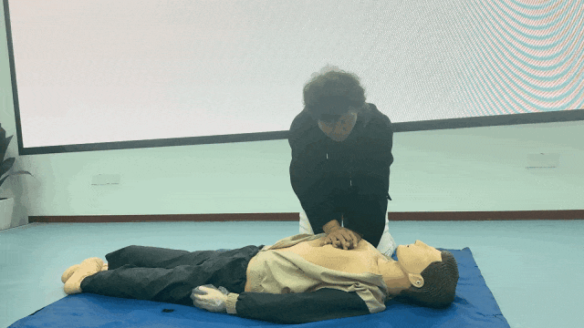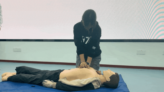 理论讲解结束后,进入实操演练环节。工作人员现场演示如何正确进行心肺复苏。