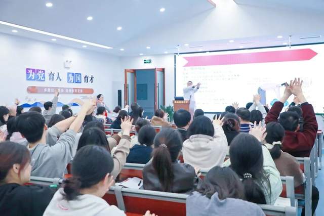 何凯医生系统讲解了心肺复苏的操作流程,从判断意识、呼叫求助、胸外按压,到开放气道、人工呼吸,每个步骤的关键要点都逐一拆解。“胸外按压深度要达到 5-6 厘米,频率保持在每分钟 100-120 次”“开放气道时要注意头部后仰、下颌上抬,避免舌头阻塞气道”…… 何医生一边讲解理论知识,一边借助人体模型进行示范,将专业的医学原理转化为易于理解和操作的技巧,让在场教职工快速掌握核心要点。