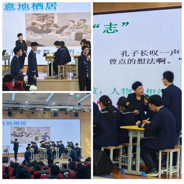 郭蓉老师本次执教篇目为《子路、曾皙、冉有、公西华侍坐》。课堂在情景剧的演绎中拉开帷幕,通过识文—解意—入境—抒怀,引导学生逐字品析对话中的情致,逐句探析文言中的智慧,在文本探究中使儒家思想之博大在交流中自然生成。