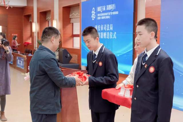 西安市司法局靳骊峰处长向三中学生代表赠送法律法规相关书籍。