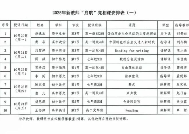 为助力新教师站稳讲台、提升教学能力,10月20-30日,学校精心组织了新教师“启航”亮相课活动。15位新教师怀揣育人初心,以课堂为舞台,用匠心与智慧开启教学征程。