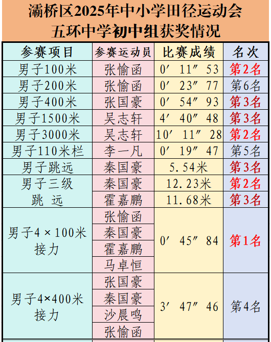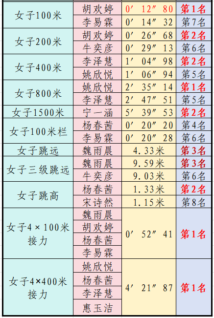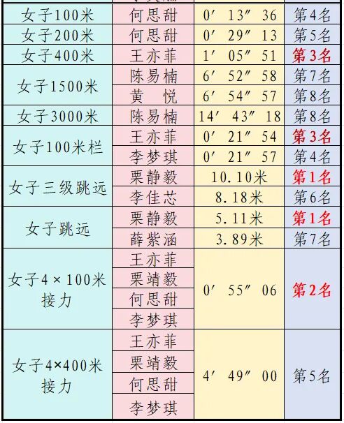 初中组继续保持往年优势,在男女20个比赛项目中,共有41人次获奖,其中个人单项赛中有15人勇夺前三名。集体项目表现尤为亮眼,初中男子4×100米接力、初中女子4×100米与4×400米接力均夺得第一名,展现出强大的团队实力。