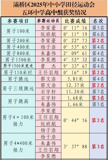 在近日落幕的灞桥区2025年中小学田径运动会上,西安市五环中学表现卓越,斩获初中组团体总分第一名、高中组团体总分第二名,并荣获大会精神文明奖,展现出优异的体育竞技水平和良好的精神风貌。