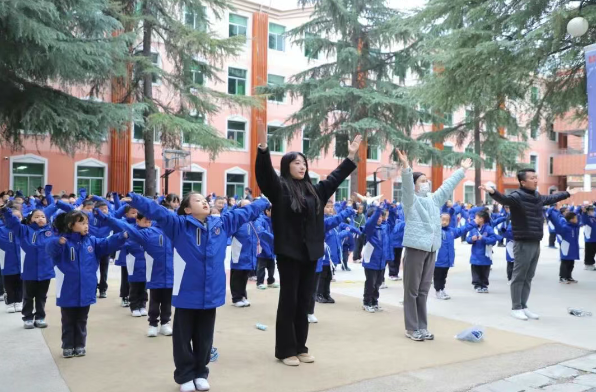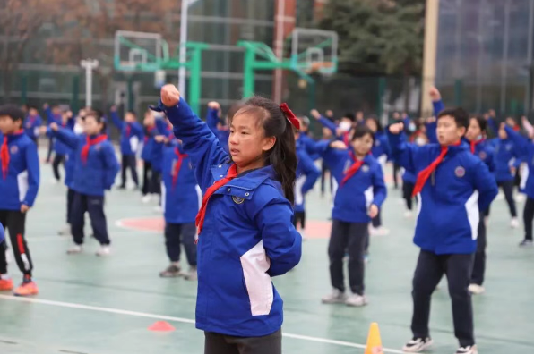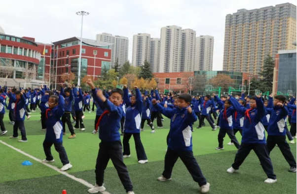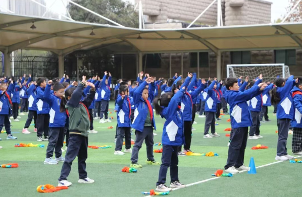 当广播体操的旋律落下,藤信园的课间时光即刻切换为 “多元活力秀场”。六个年级分场地同步绽放,用专属律动书写童年风采:一年级的小萌娃们手持跳绳,跃动的身影如春日新芽,在绳间编织着童真与灵动;二年级伴着《你要跳舞吗》的欢快节奏,摆臂、扭胯、踏步,每一个动作都洋溢着治愈系的可爱;三年级的彩带在空中划出绚丽弧线,《向快乐出发》的旋律里,孩子们用灵动舞姿勾勒出成长的欢歌;四年级的有氧健身操《让我们一起出发》,动作整齐有力,尽显少年们的蓬勃朝气;五年级以《中国范》街舞燃动全场,利落的节拍、酷炫的姿态,跳出新时代少年的自信锋芒;六年级的《中国功夫》武术操气势如虹,抱拳、踢腿、冲拳,一招一式间尽显中华少年的阳刚之气。