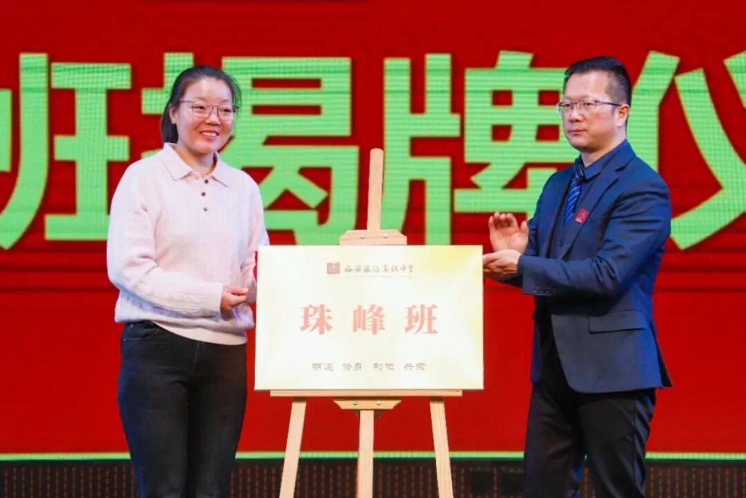 活动现场,刘卫校长代表学校为何静女士颁发聘书,聘任她为学生成长导师。随后,二人共同为“珠峰班”揭牌,以登山精神为班级赋能,期许学子们传承勇攀高峰的信念,在求学路上坚毅前行、逐梦致远。