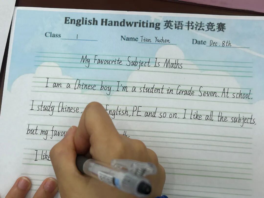 这场比赛,不止是一场书写的较量,更是一次对英语学习细节的聚焦。规范的书写习惯,是英语学习的“门面”,既能帮同学们在考试中避免因卷面失分,更能通过一笔一划的打磨,加深对单词、句型的记忆,让英语学习从“会说会写”进阶到“写好写美”。