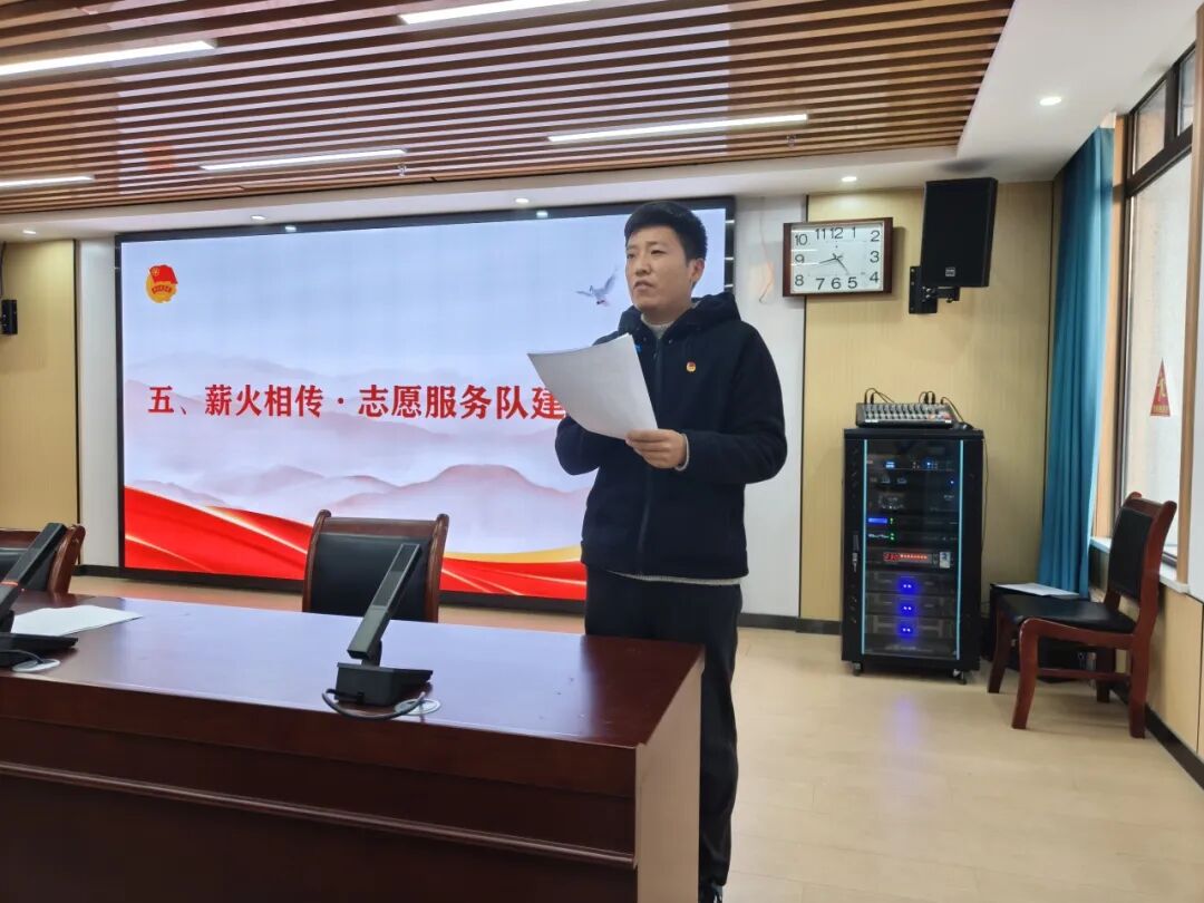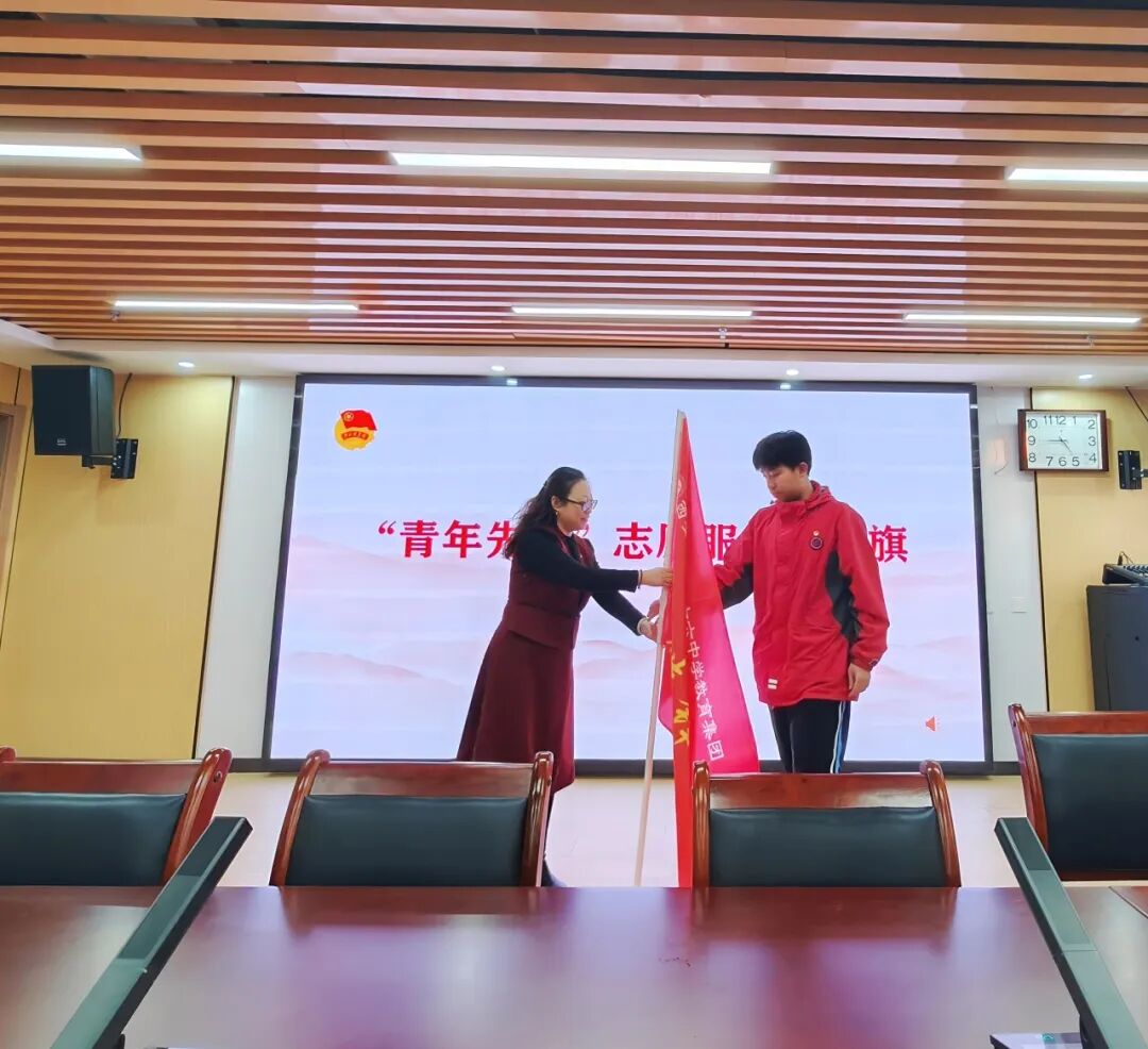 “青年先锋”志愿服务队的成立仪式随之拉开序幕。校团委艾思文老师详细介绍了服务队的计划与内涵。在全体团员见证下,杜莉副校长向“青年先锋”志愿服务队队长傅秋博同学授予队旗。随后,全体团员在队旗下庄严宣誓,承诺践行志愿精神,传承红色基因,争做时代先锋,将历史的传承与当下的行动紧密相连。
