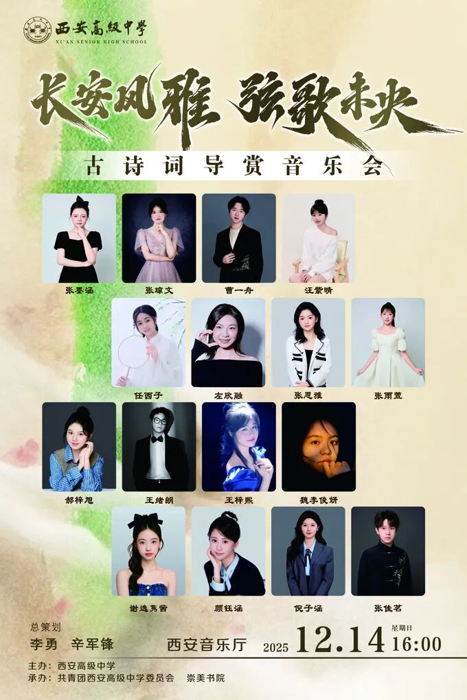 12月14日,西安高级中学崇美书院在西安音乐厅举办了一场以“长安风雅 弦歌未央”为主题的古诗词导赏音乐会。本次活动将古典诗词与音乐相融合,通过声乐演唱与器乐演奏交替呈现,为现场观众带来一场穿越千年的文化视听盛宴。
