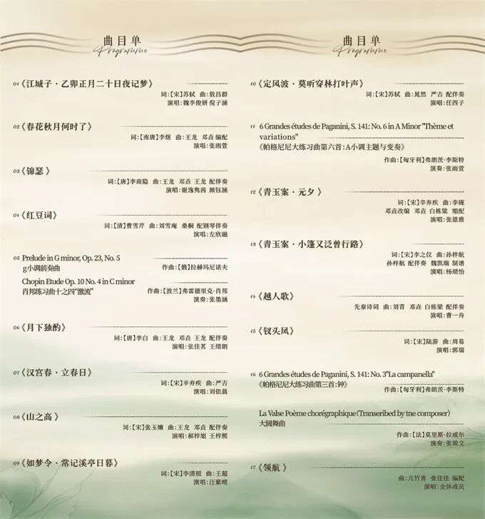 在辛军锋校长致辞之后,崇美书院音乐特长生表演了精心编排的十六个节目。乐曲涵盖从先秦至清代的经典诗词作品,有《江城子·乙卯正月二十日夜记梦》《定风波·莫听穿林打叶声》等苏轼名篇,也有《春花秋月何时了》《锦瑟》《月下独酌》等唐五代诗词佳作。李煜的哀婉、李白的飘逸、李清照的婉约、辛弃疾的豪放,在音乐中焕发新的艺术感染力。