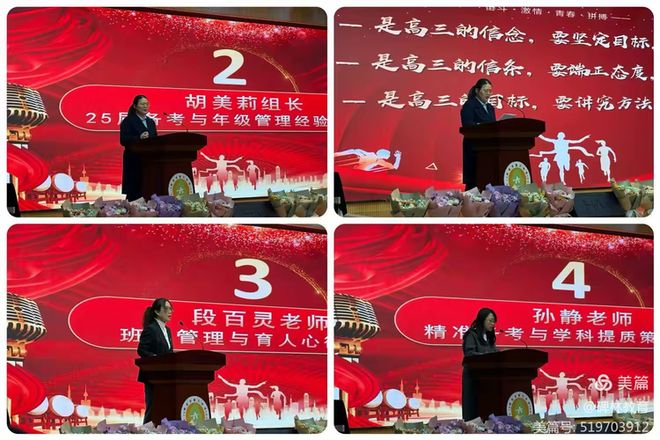 随后,经验分享环节干货满满:胡美莉组长结合2025届备考全周期管理实践,从“年级节奏把控、资源统筹调配、师生状态激励”三方面,详解“分层施策、动态调整”的备考管理模式;段百灵老师以“班级为核、育人为本”为切入点,分享“个性化成长档案 + 小组互助机制”的班级管理经验,阐释“以心育心、以行导行”在高考备考中的育人价值;孙静老师则聚焦学科提质,围绕“课标解读、考题研究、课堂增效、作业精准”四大维度,提出“以考定教、以练促能”的学科备考策略,为各学科精准发力提供了实操参考。