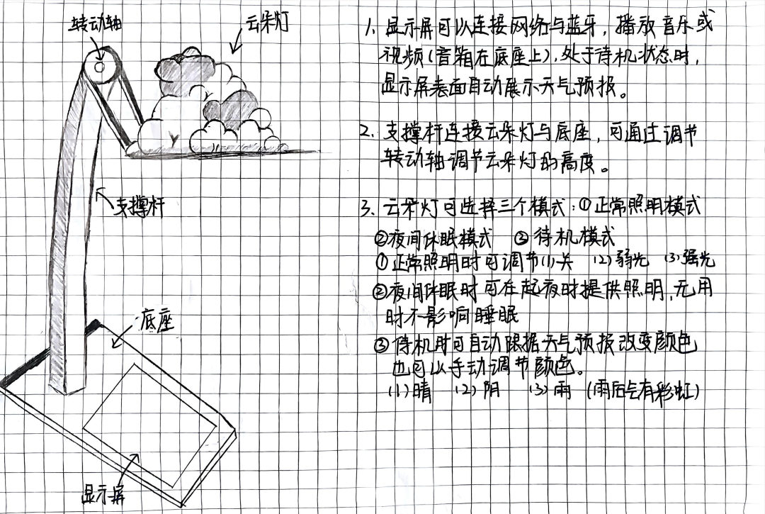 台灯设计专为高中生日常学习场景打造,围绕护眼、便捷、创新等需求展开。这款台灯设计是学生创新意识、问题解决、工程思维与技术应用能力的集中呈现。以高中生学习痛点为切入点,用技术创新回应实际需求,尽显综合素养。力求为高中生打造一款安全、舒适、适配学习生活的专属台灯。