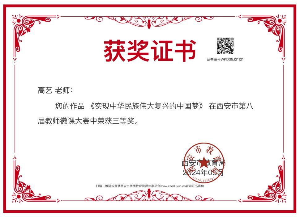 高艺,中共党员,硕士研究生,西安市临潼区华清中学思想政治教师,从教以来深耕思政教学领域,以赛促研锤炼教学本领,以研促教提升育人质效。多年的教学实践中,着重于思政理论钻研与教学实践的深度融合,锤炼打磨造就了扎实的教学功底,于守正传承与创新探索的双向奔赴中培育时代新人。用专业成长陪伴学生成长,用教育热忱点亮学生心灵,引领学生明辨价值取向、厚植家国情怀,为他们扣好人生的第一粒扣子。