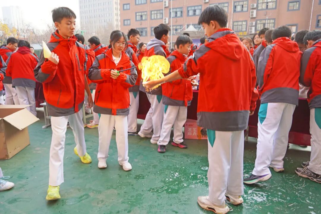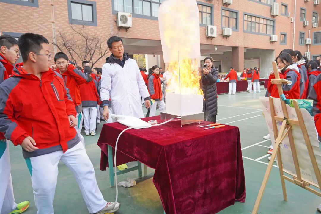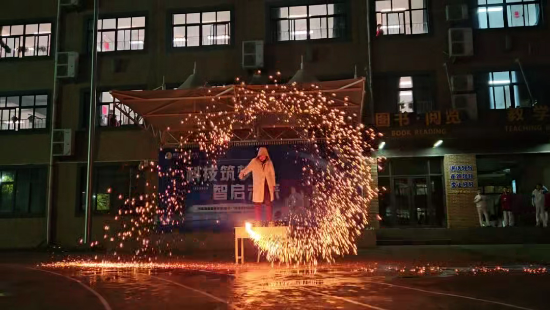 在打铁花表演中,砂轮磨亮的钢丝绒蓬松如絮,触火即燃,老师们用力甩动装置,千万点橘红熔铁挣脱束缚,刹那间金光四溅、流星如雨,宛若一场迷你的烟火秀。同学们目不转睛,惊叹声此起彼伏,操场上洋溢着科学与艺术交融的浪漫。