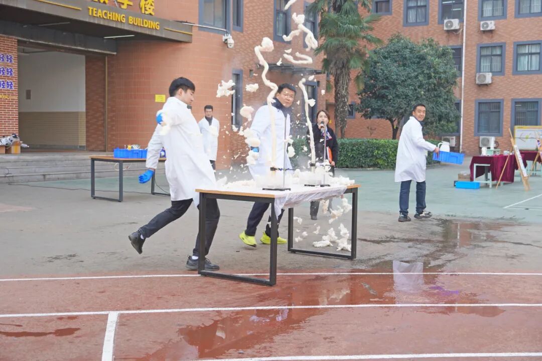 “大象牙膏”实验中,老师们将浓缩的过氧化氢与洗洁精混合,加入催化剂,牙膏般的泡沫状物质像喷泉一样从容器中喷涌而出。壮观的现象,将现场气氛推向高潮,并生动诠释了催化反应的效率之美。