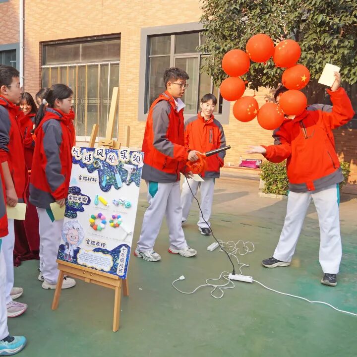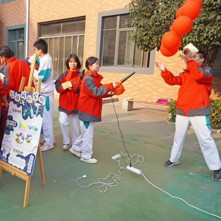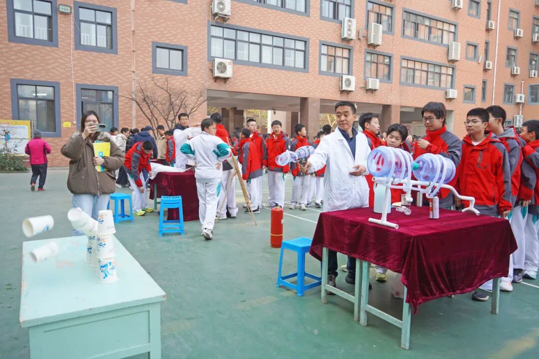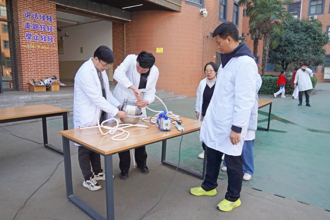 1654年德国马德堡市的一场令人瞠目结舌的实验再现此次科技节。老师们将两个金属半球紧密对接,通过特制的抽气泵将球内空气抽出。16名男同学先后上场,分成两队,手拉半球上的绳子,用尽全力向两端拔开,可半球却纹丝不动。直到老师们打开阀门,空气重新涌入,半球瞬间轻松分开。这一经典的“马德堡半球实验”的再现,让同学们直观深刻地感受到了大气压强的巨大力量。