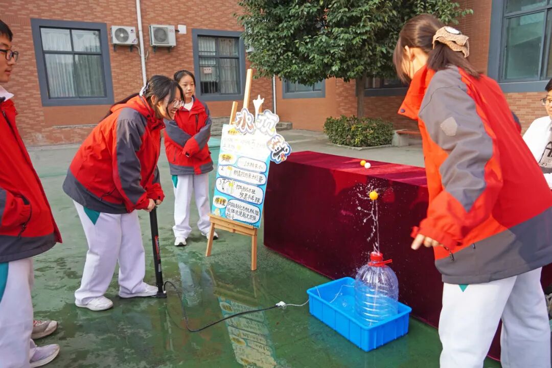 在“水火箭”表演中,随着"三、二、一,发射!"指令响起,老师们按下发射按钮,水火箭借由水与气压的精妙配合迸发出强劲推力,拖着晶莹的水雾直破苍穹。欢呼声中,火箭划出优雅弧线,最终乘着降落伞优雅谢幕。