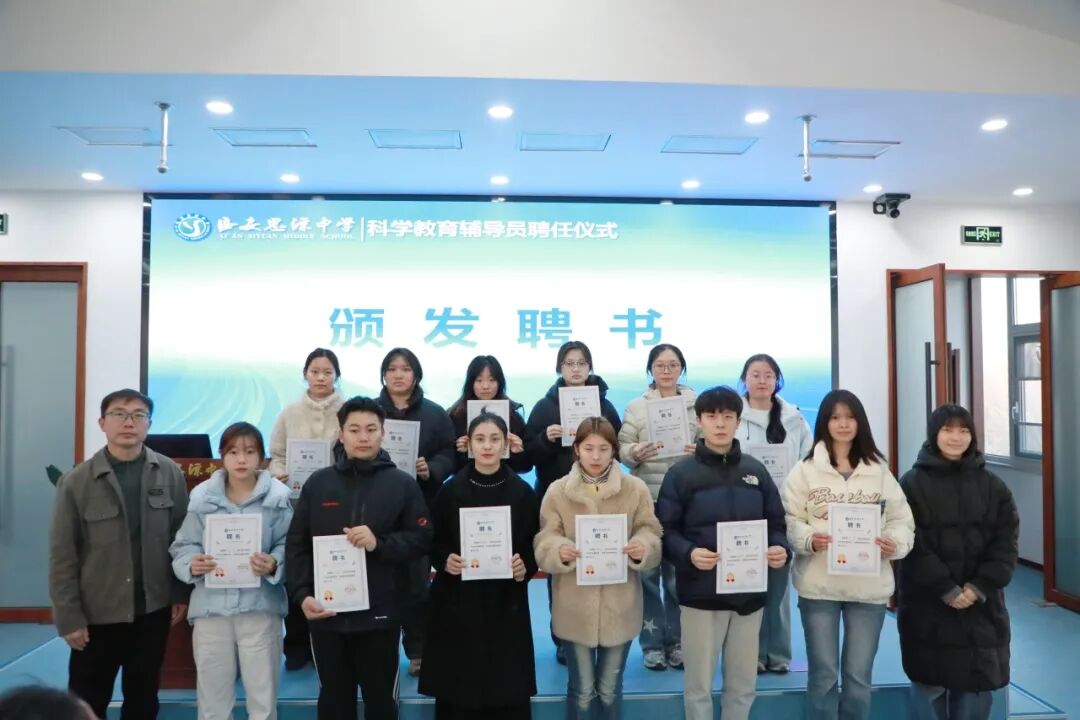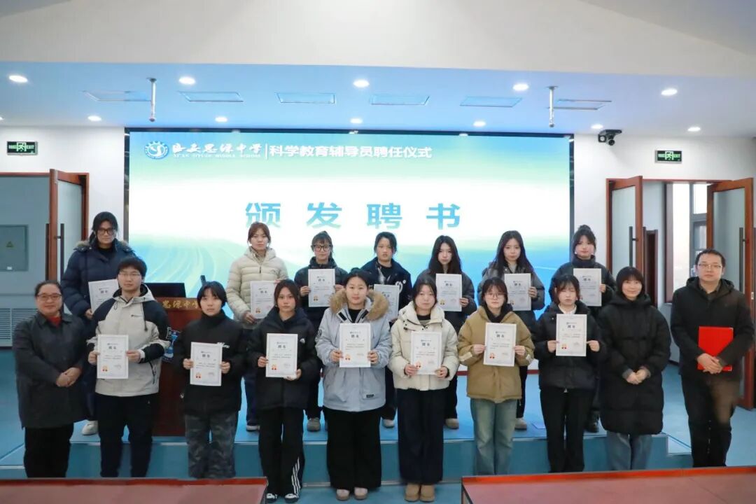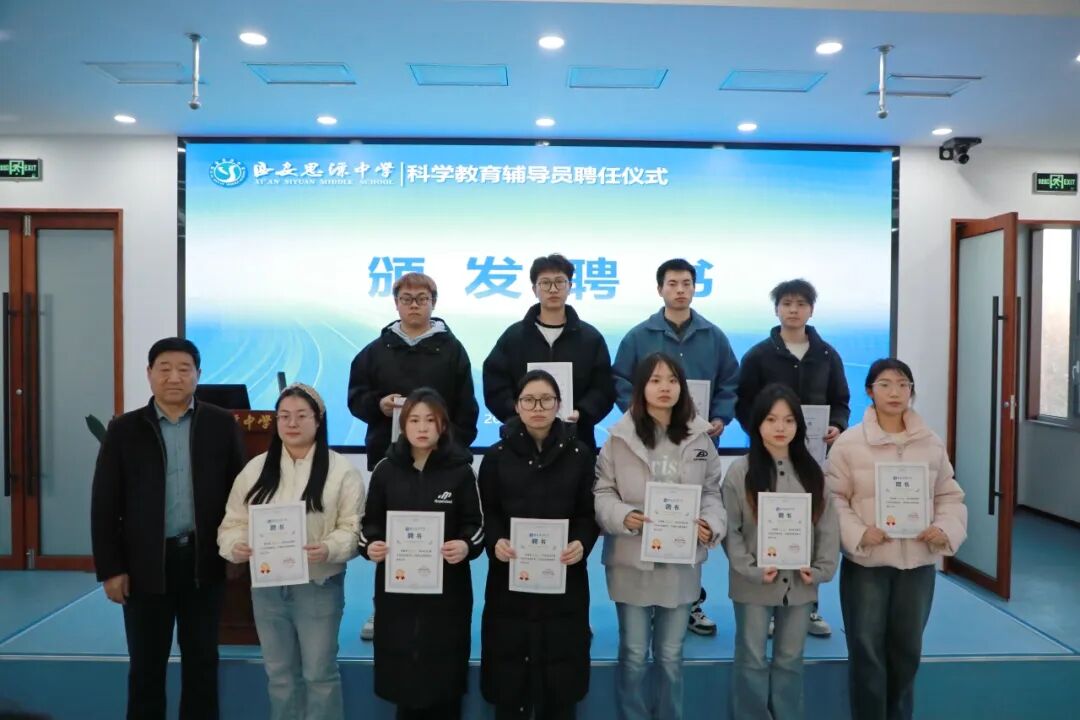 科学点亮未来,教育孕育希望。12月25日下午,西安思源中学举行科学教育辅导员聘任仪式,校长王琪、德育副校长王强、校长助理高建伟、教务处主任张皓、科学教育负责人任毅参与此次仪式。来自西安思源学院的优秀学生接过聘书,正式受聘成为西安思源中学科学教育辅导员,肩负起校园科学普及与探索的引领使命。