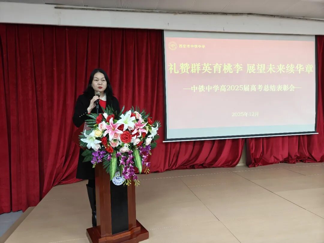 岁末回眸满硕果,蓄力前行启新程。为总结新高考备考经验,表彰先进团队与个人,凝聚教育合力,2025年12月29日下午,西安市中铁中学隆重召开以“礼赞群英育桃李,展望未来续华章”为主题的高2025届高考总结暨经验交流研讨会。学校中层以上干部及全体高中教师、初中年级组长、行政人员参会,大会由教学副校长李媛主持。