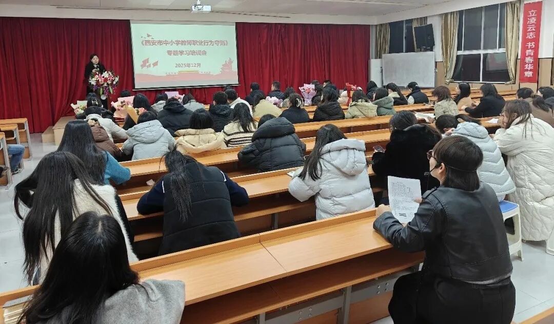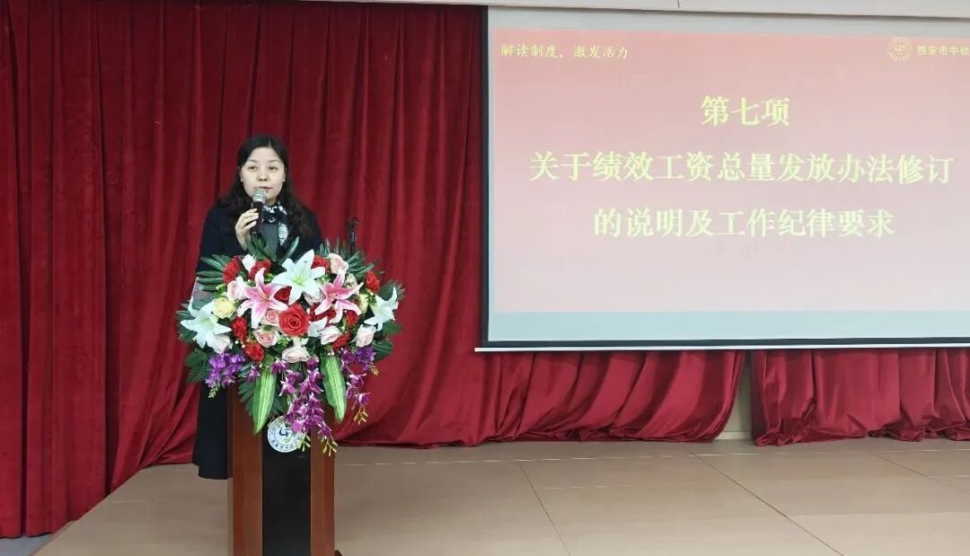 行政副校长贾平利对学校近期修订的绩效工资考核办法进行解读,强调了其规范管理与激励引导的双重作用。随后,贾平利副校长带领与会教师共同学习了《西安市中小学教师职业行为守则》,要求大家自觉规范教育教学行为,共同营造风清气正、务实进取的教育生态。